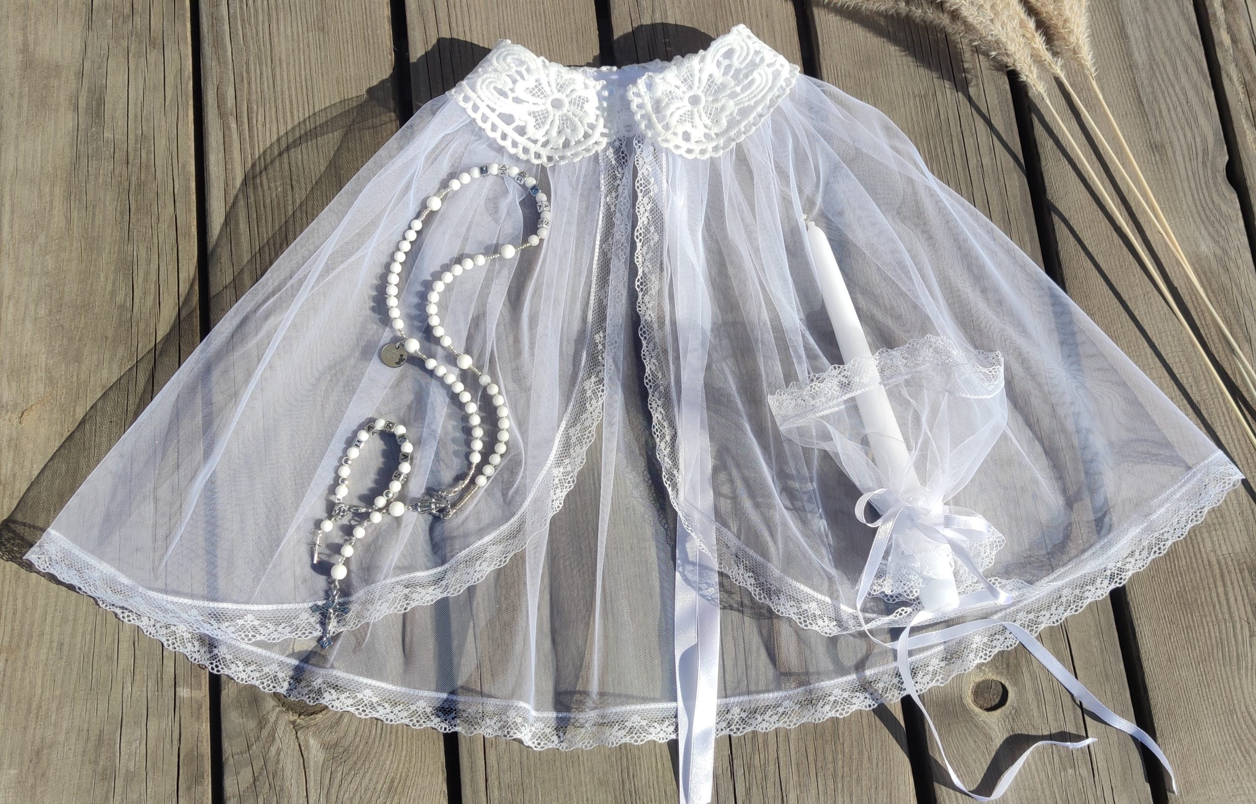 Perkant komplektuką ( Skraistę + žvakes papuošimą) . Rožančius rankytei tik 1 eur , vardinis tik 2eur.