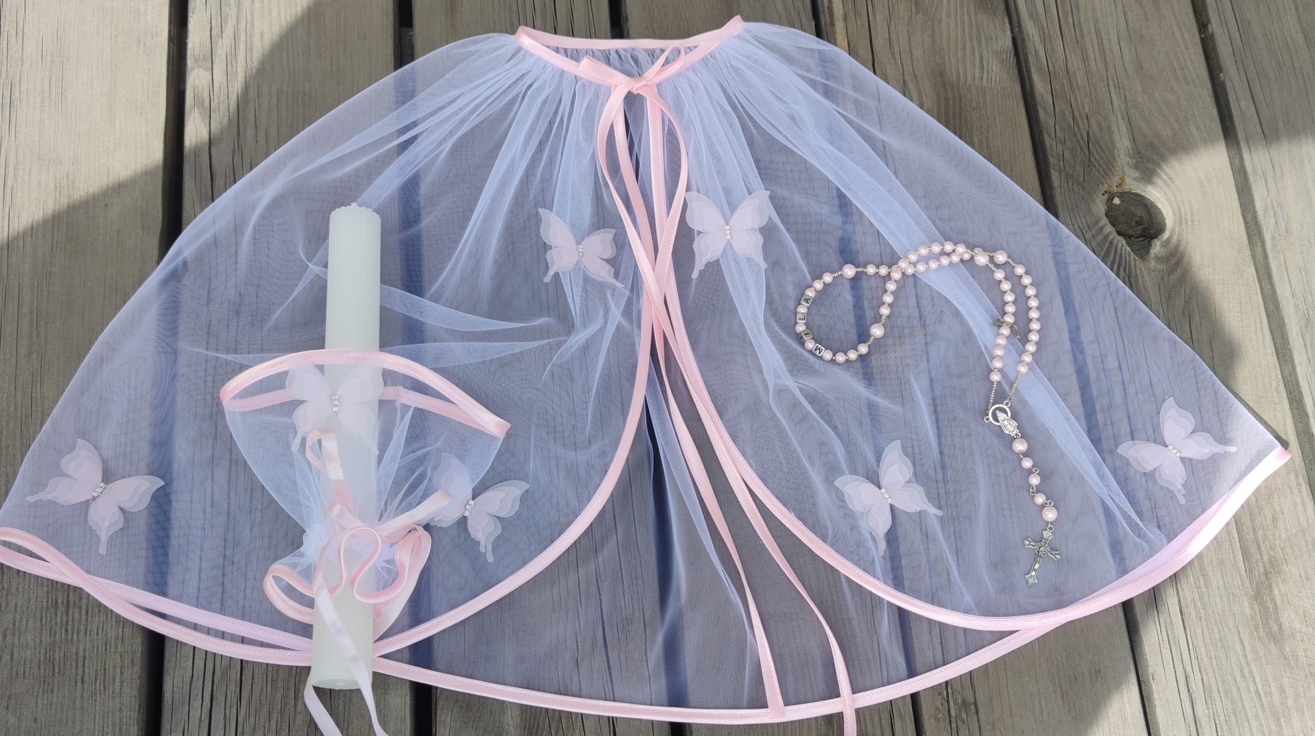 Perkant komplektuką ( Skraistę + žvakes papuošimą) . Rožančius rankytei tik 1 eur , vardinis tik 2eur.