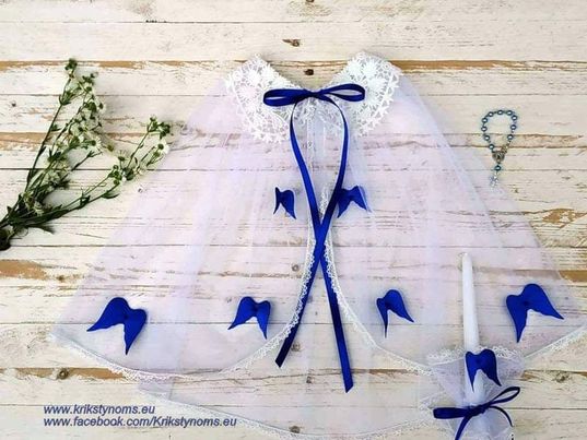 Perkant komplektuką ( Skraistę + žvakes papuošimą) . Rožančius rankytei tik 1 eur , vardinis tik 2eur.