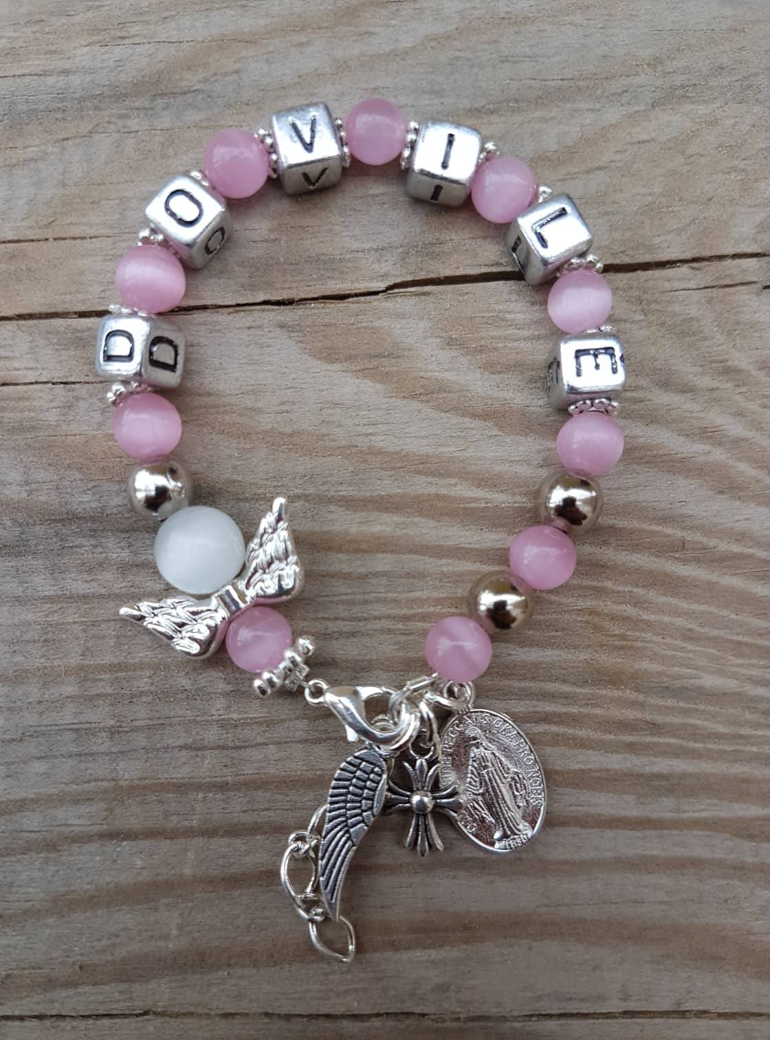 Rožinė apyrankė (katės akis) su Šv.Mergelės Marijos medalionu