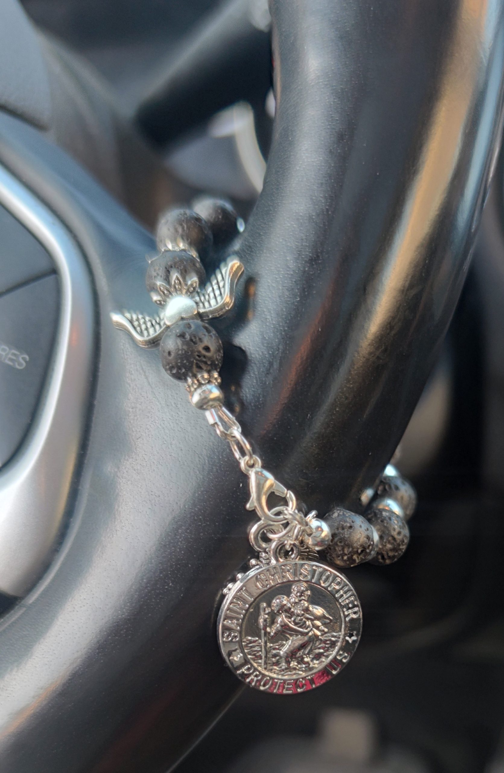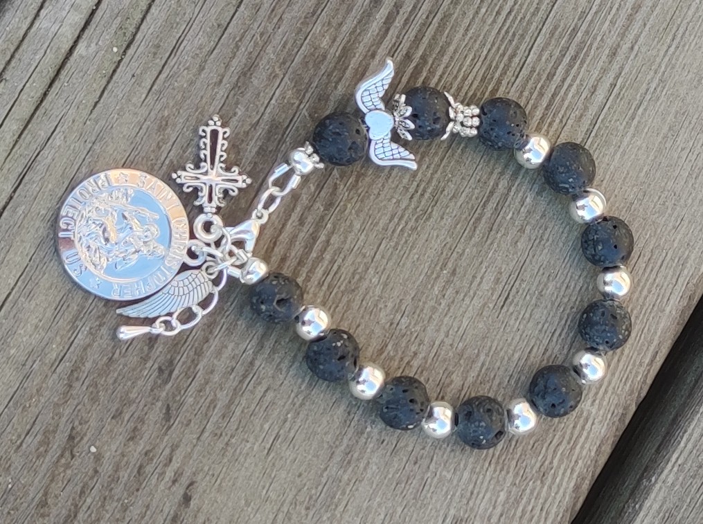 Juodi lavos karoliukų rožančius su šv. Kristoforo medalionu simbolizuoja stiprybę ir apsaugą kelionėse. Lavos akmuo, su savo žemiškąja energija, suteikia stabilumo, o šv. Kristoforo medalionas užtikrina saugumą ir dvasinę globą. Toks rožančius padeda išlaikyti ramybę ir saugumą tiek kelionėse, tiek kasdieniniame gyvenime.