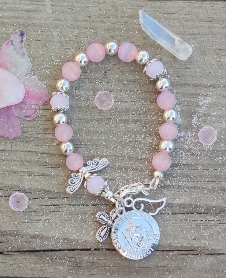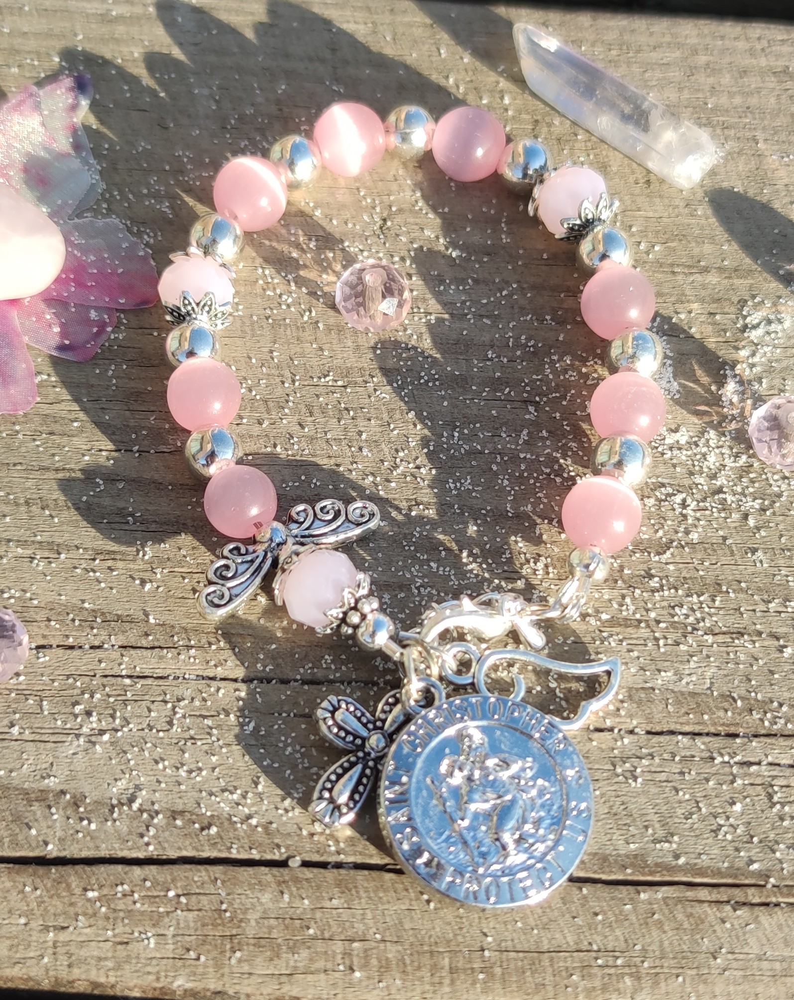 Rožinių karoliukų rožančius su šv. Kristoforo medalionu suteikia apsaugą ir ramybę kelionėse. Šis elegantiškas rožančius simbolizuoja meilę ir dvasinę globą, padėdamas saugiai pasiekti tikslą ir jaustis ramiai kiekviename žingsnyje.