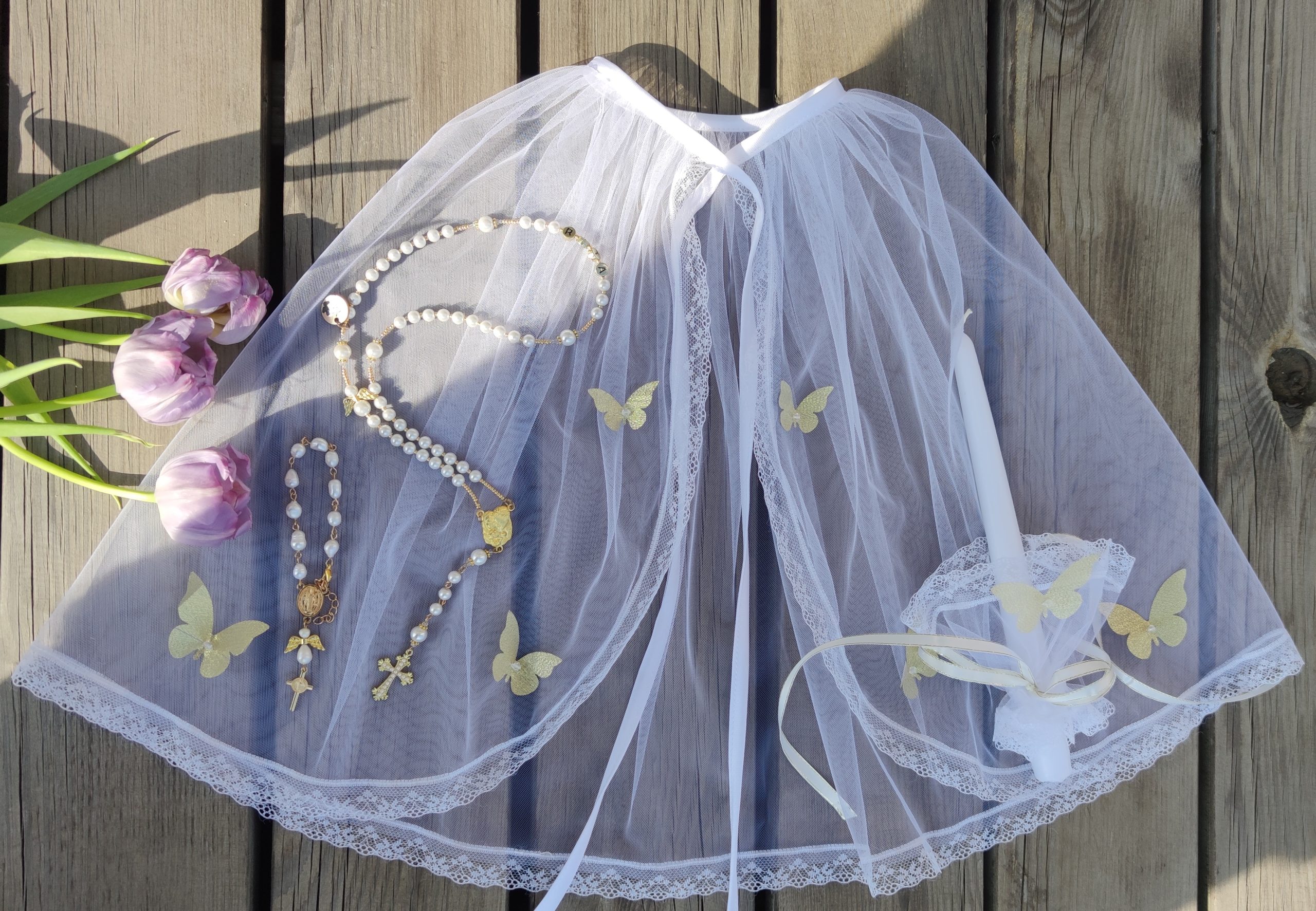 Perkant komplektuką ( Skraistę + žvakes papuošimą) . Rožančius rankytei tik 1 eur , vardinis tik 2eur.