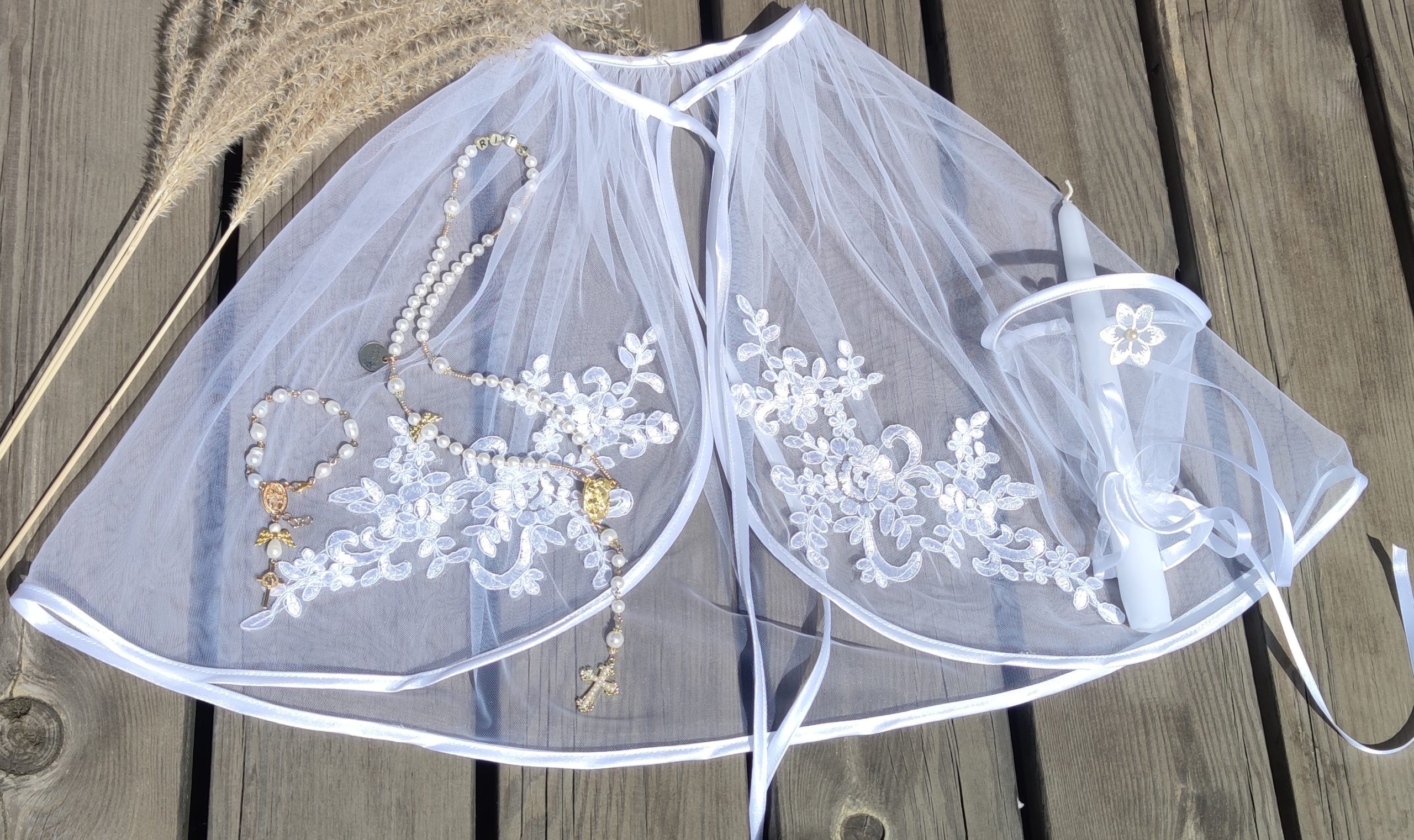 Perkant komplektuką ( Skraistę + žvakes papuošimą) . Rožančius rankytei tik 1 eur , vardinis tik 2eur.