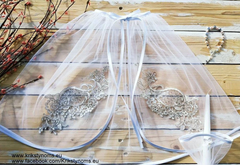 Perkant komplektuką ( Skraistę + žvakes papuošimą) . Rožančius rankytei tik 1 eur , vardinis tik 2eur.