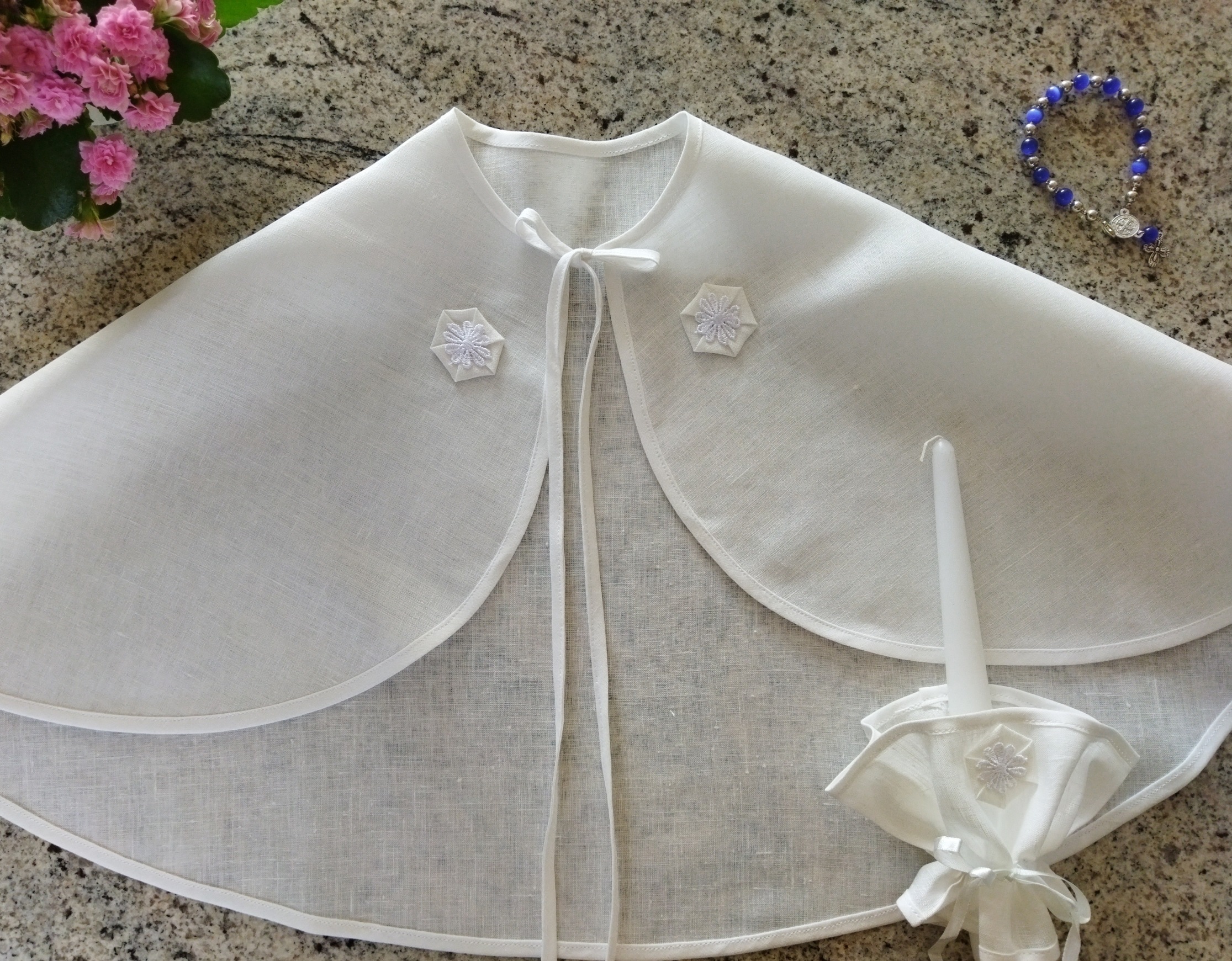 Perkant komplektuką ( Skraistę + žvakes papuošimą) . Rožančius rankytei tik 1 eur , vardinis tik 2eur.