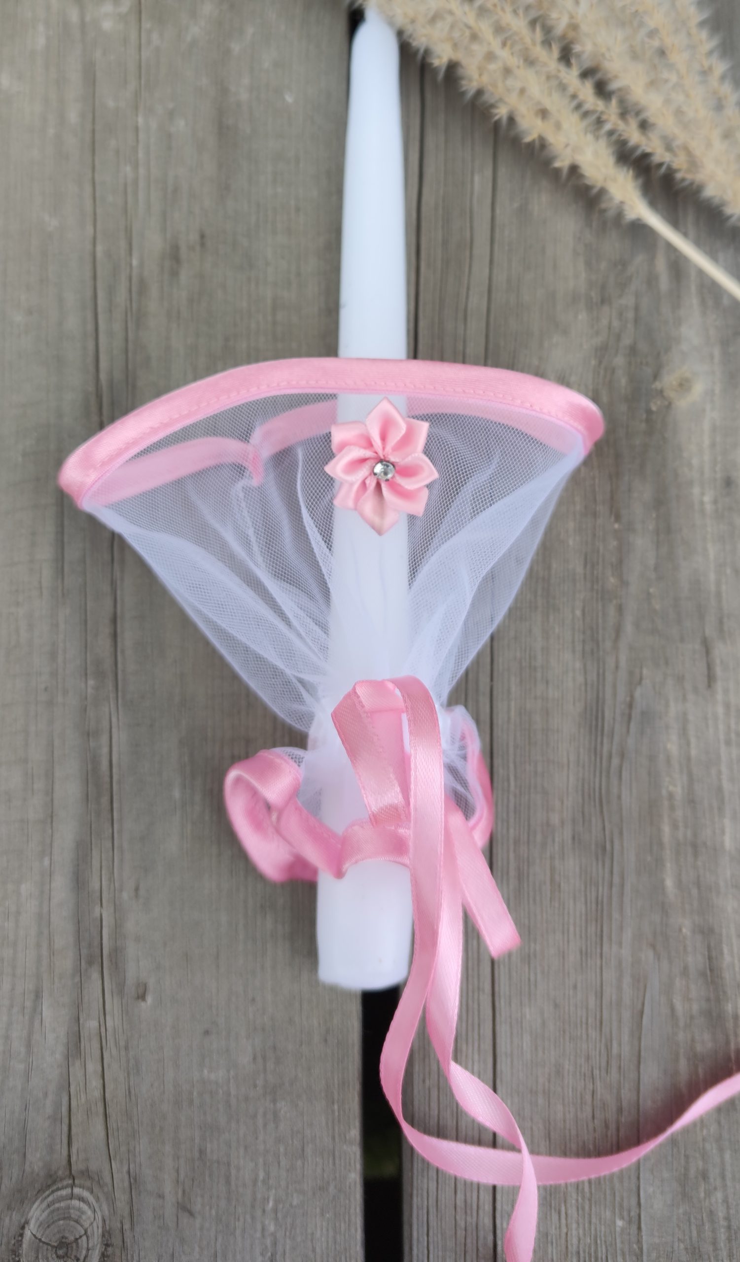 Būkite pirmas aprašęs “Tiulio, rožinės spalvos apsiuvimu su gėlyte žvakės papuošimas”