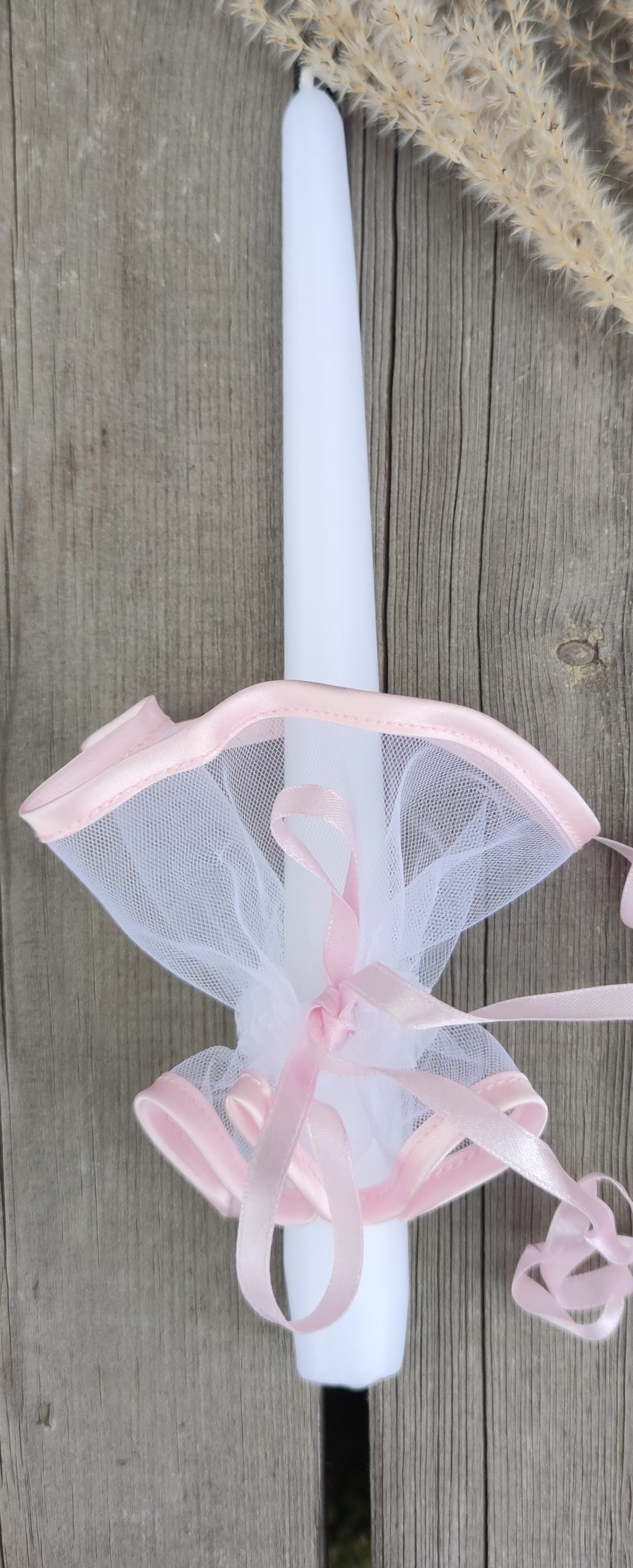 Tiulio, rožinės spalvos apsiuvimu žvakės papuošimas