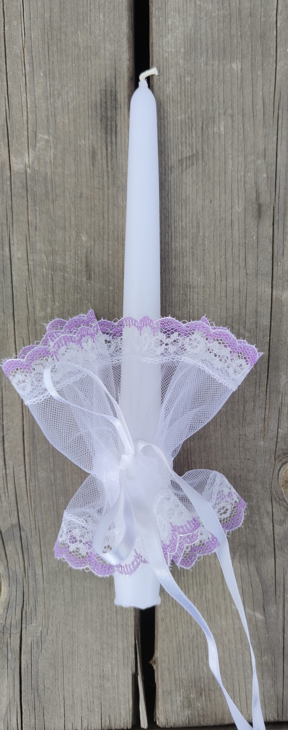 Būkite pirmas aprašęs “Tiulio, violetinės spalvos krašteliu žvakės papuošimas”