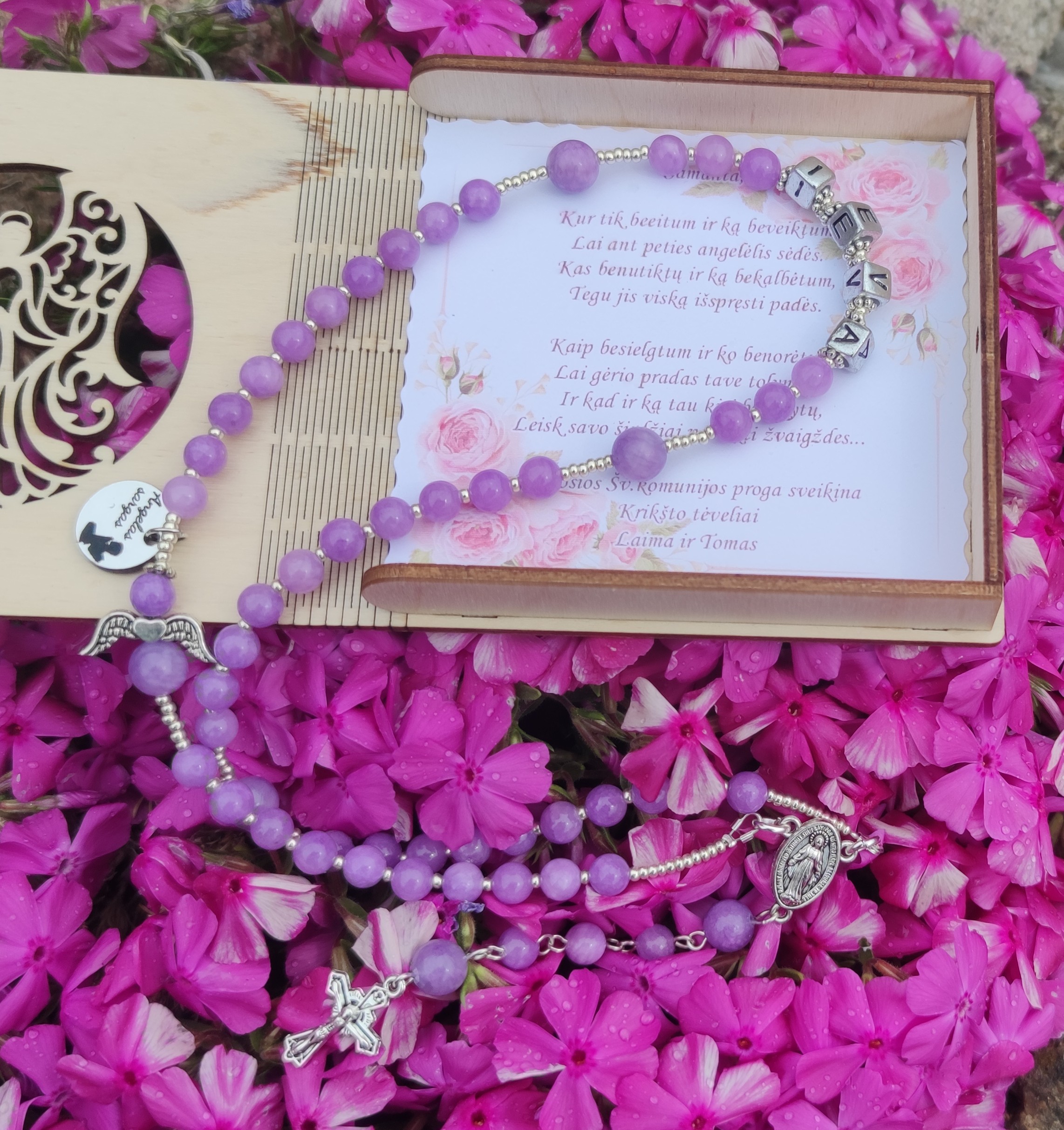 Kaina tik už rožančių, dėžutę su sveikinimu galima įsigyti už papildomą mokestį.